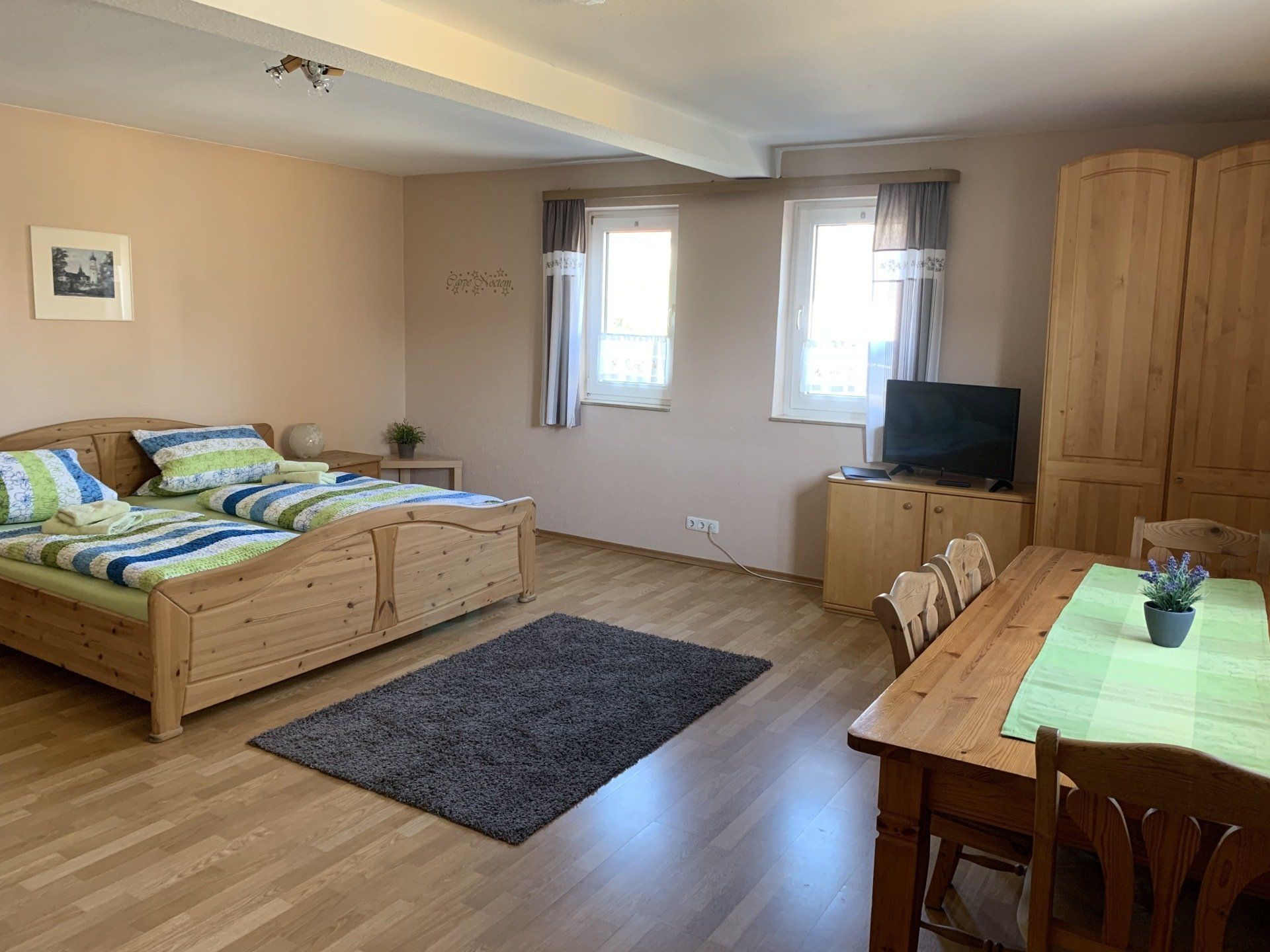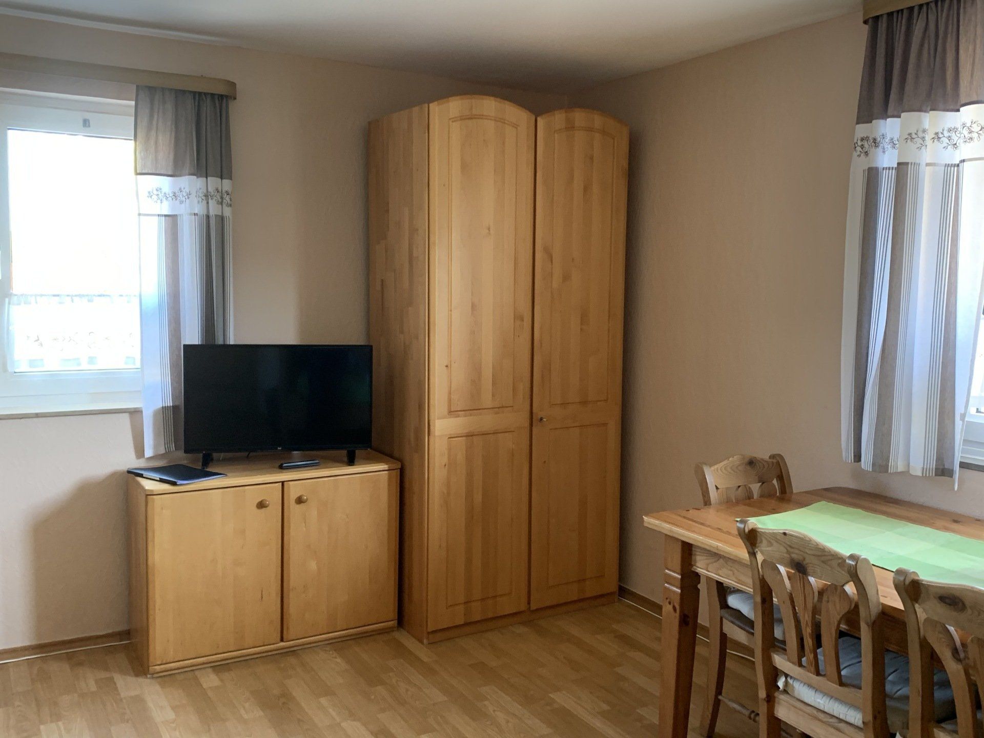 Im Zimmer erwarten Sie ein großes Doppelbett sowie ein Einzelbett. Zudem gibt es einen großen Tisch mit vier Stühlen, einen Kleiderschrank und einen Fernseher. Eine gemütliche Ledercouch rundet die Ausstattung ab. Auf Wunsch kann das Appartement auch als Dreibettzimmer genutzt werden. Dieses Zimmer bietet Ihnen den perfekten Rückzugsort für Ihren Aufenthalt und vereint Komfort mit praktischen Annehmlichkeiten.